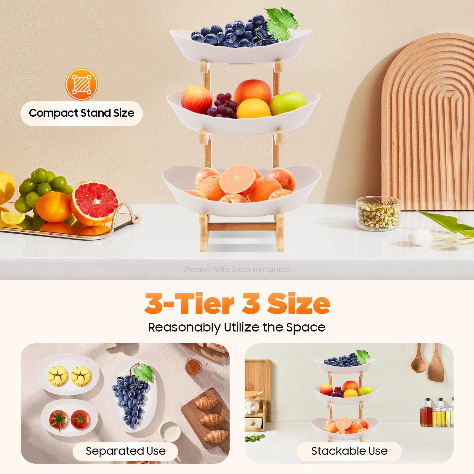 Space Optimization: Compact stand size (8.86*5.51*12.6in) can reasonably utilize the space, while the fruit tray that can be separated and stackable for use is also convenient for you to store and achieve space optimization.