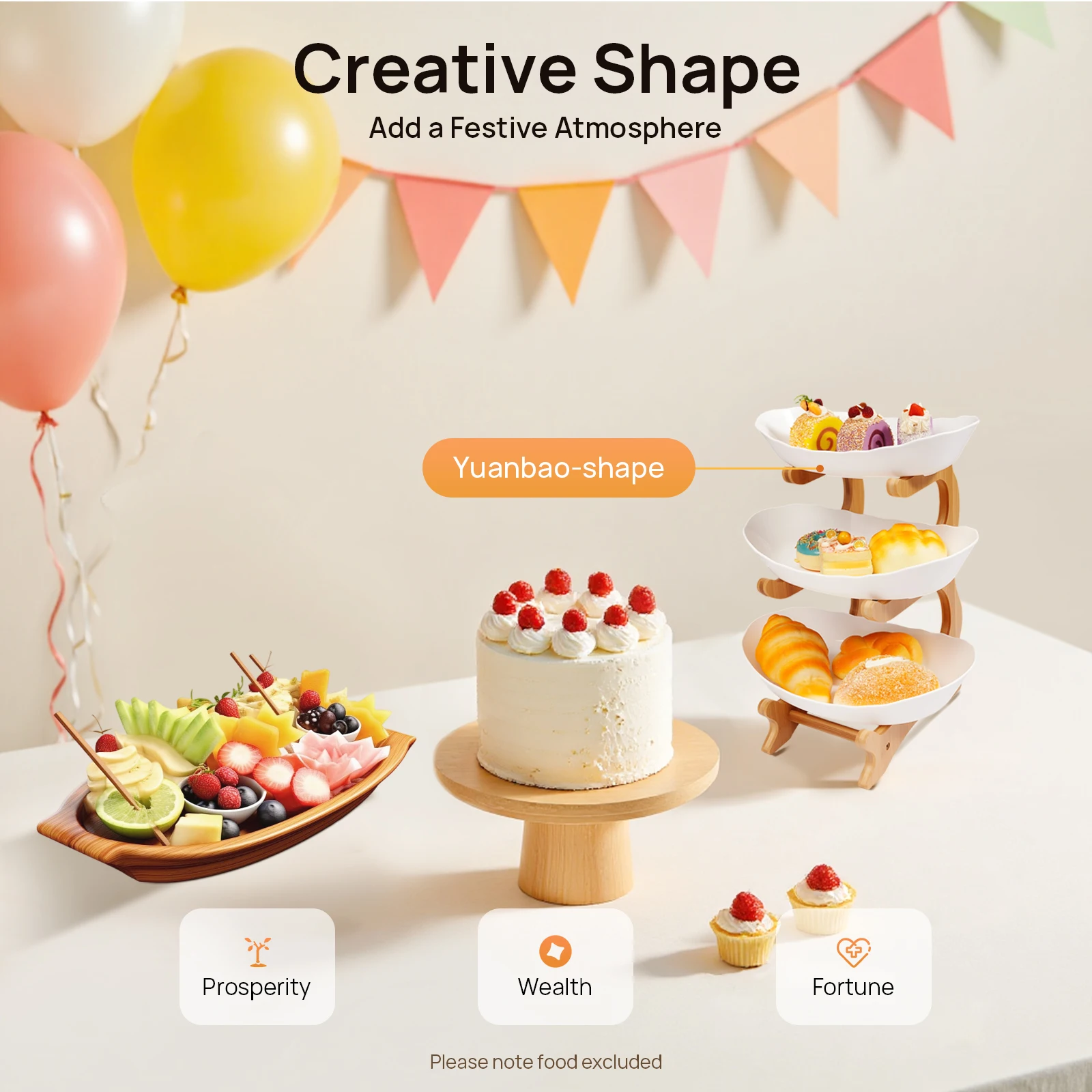 Creative Yuanbao Shape: Yuanbao-shaped fruit plate with bamboo and wood shelves, is not only beautiful and unique but also sends good wishes for family prosperity, wealth, and prosperity, for family gatherings or holiday celebrations to add a festive atmosphere.