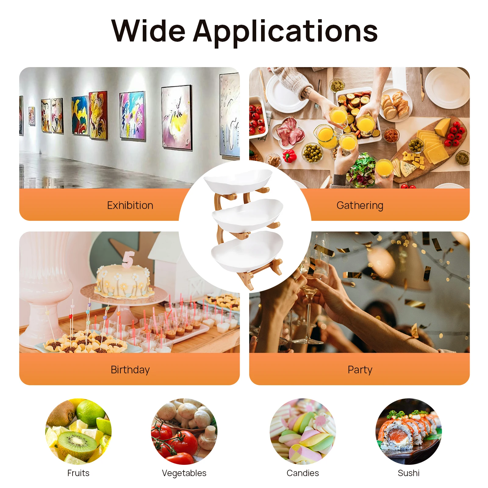 It is used to display fruits, candies, desserts, jewelry, food, and toys and is ideal for festivals, birthdays, parties, weddings, formal or informal gatherings, and more. It is also suitable for storing small items such as keys and headphones on your living room desktop or entryway table.