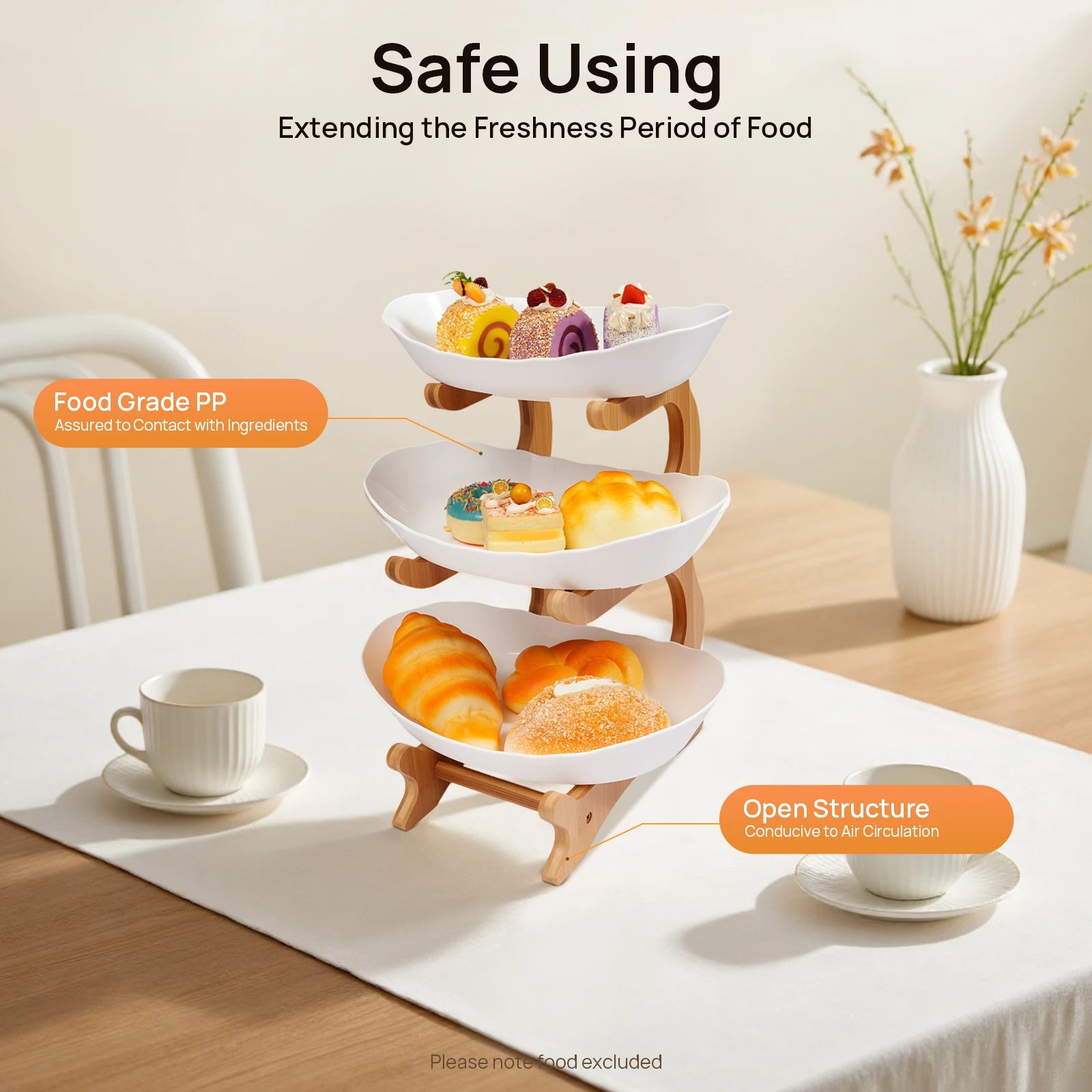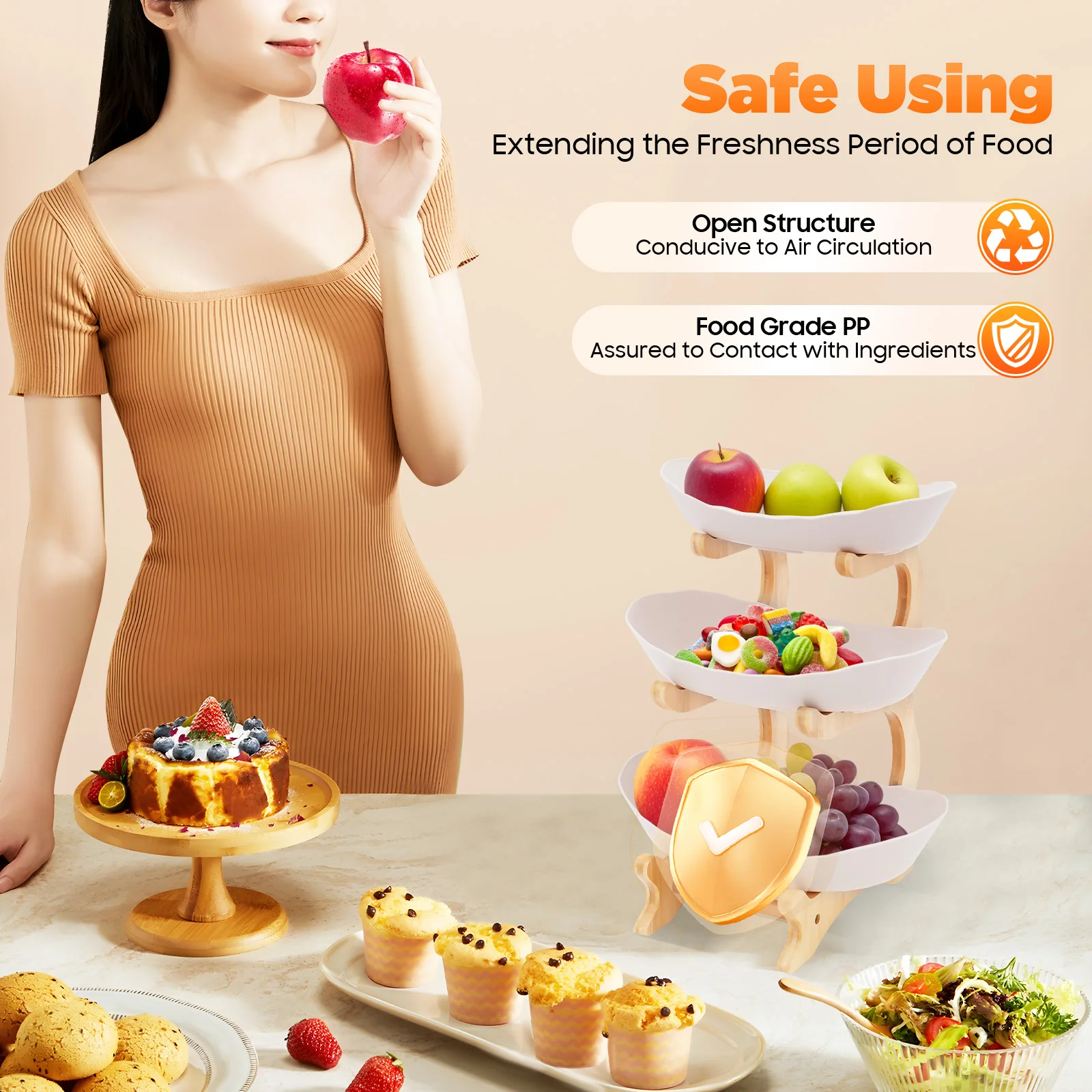 Eco-friendly and Hygienic: Food grade PP material and eco-friendly bamboo wood frame are non-toxic and odorless, ensuring the safety and hygiene of the food placed. In addition, the open structure design is conducive to air circulation, reducing moisture accumulation and extending the freshness period of food.