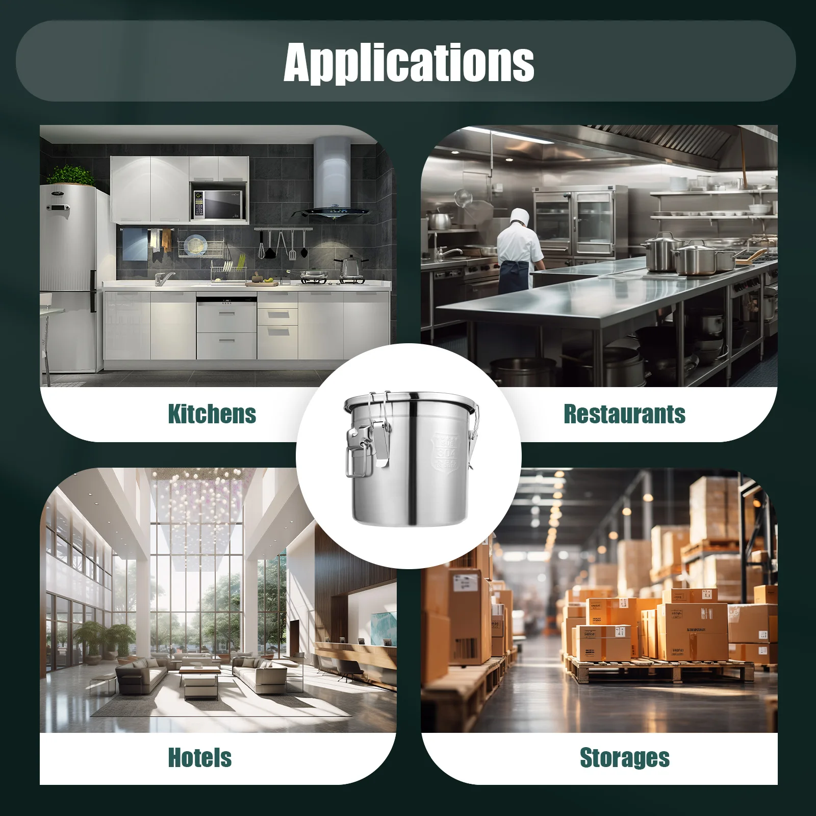 It is ideal for storing various dry/wet items, such as rice, flour, cereals, tea, spices, etc, in hotels, restaurants, kitchens, warehouses, living rooms, etc.