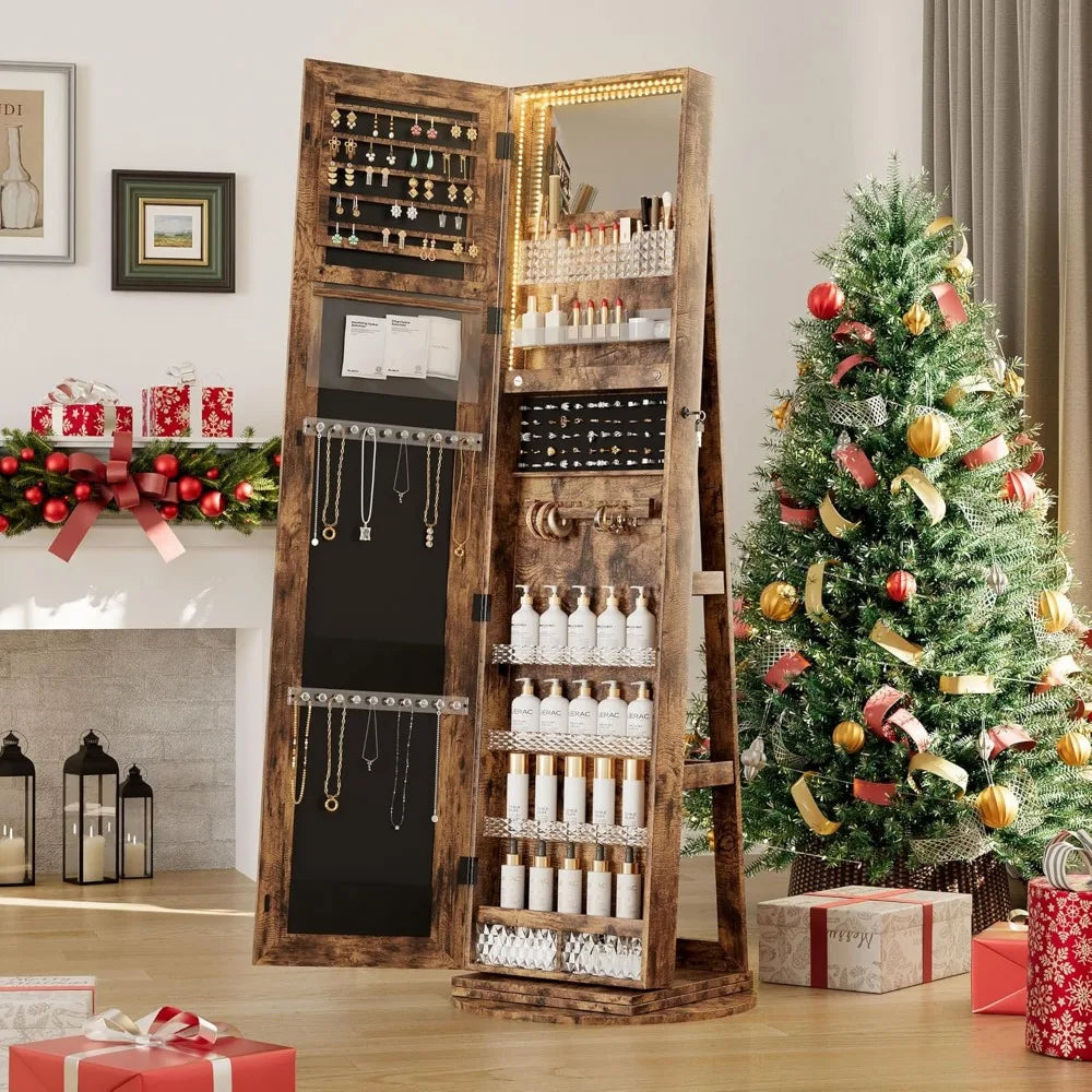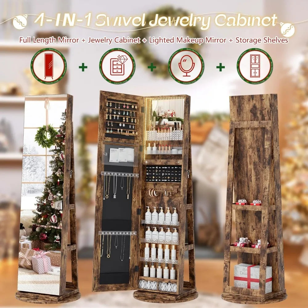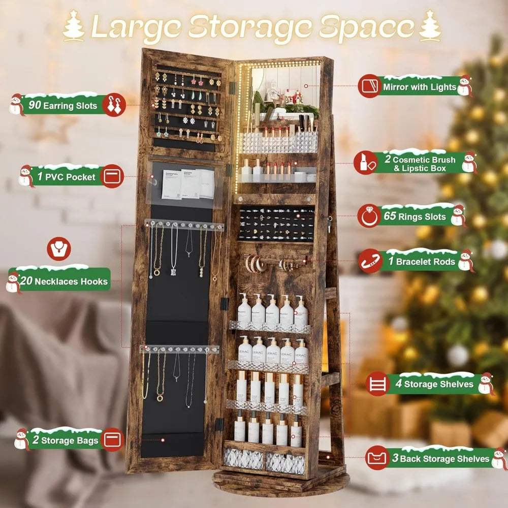 MKDK Mirror Jewelry Cabinet Armoire With LED Lighting 360 Degree Swivel Lockable
