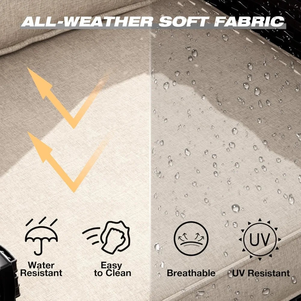 - Thick Cushions with Easy Care Covers: 4-inch high-density sponge cushions; olefin fabric covers that are breathable, UV-resistant, and waterproof; removable with a zipper for cleaning.